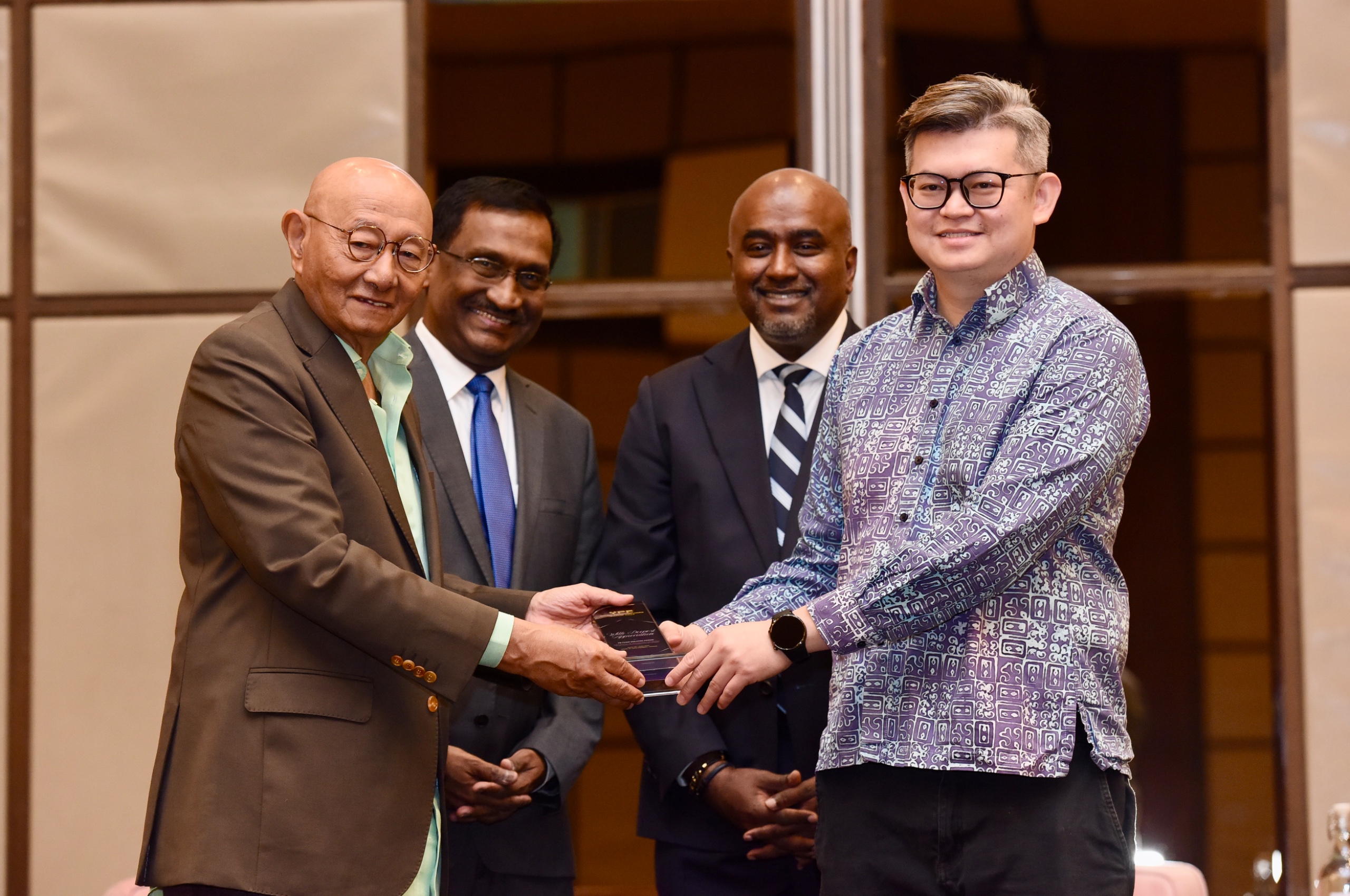 Patron of PRactitioners, Yang Amat Mulia Tengku Azlan Ibni Almarhum Sultan Abu Bakar (left) presenting a token of appreciation to, Political Secretary, Minister of Human Resource, YB Dr Kelvin Yii (right), witnessed by Chairman of PRactitioners Malaysia, Datuk P. Kamalanathan (second from left) and the Organising Chairman of PRactitioners Malaysia, Mr. Christopher Raj (third from left)